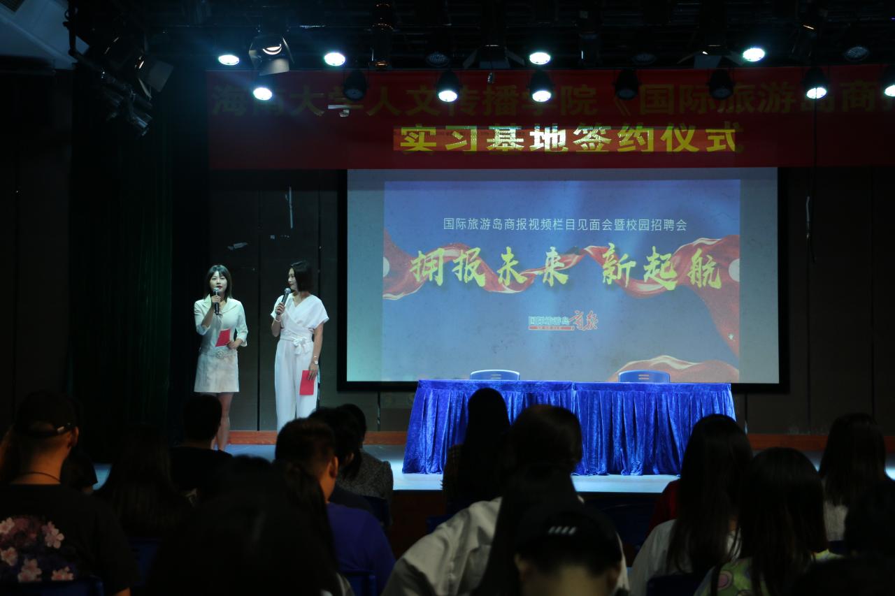 签约仪式由《国际旅游岛商报》主播符由嘉、出镜记者刘宁玥主持,导演兼制片人张泽瑜嘉、总编助理兼全媒体融合采编中心副总监常珊珊、采访中心主任段然、新媒体中心主任张慧莹、直播运营李晨阳、策划专员滕鹏飞与李美琴以及视频组成员刘顺德、戴铭、王世杰、李瑶、郭晃共同参加。主持人首先介绍了出席本次活动的嘉宾及《国际旅游岛商报》的基本情况,表达了与公司建立合作关系的愿望。