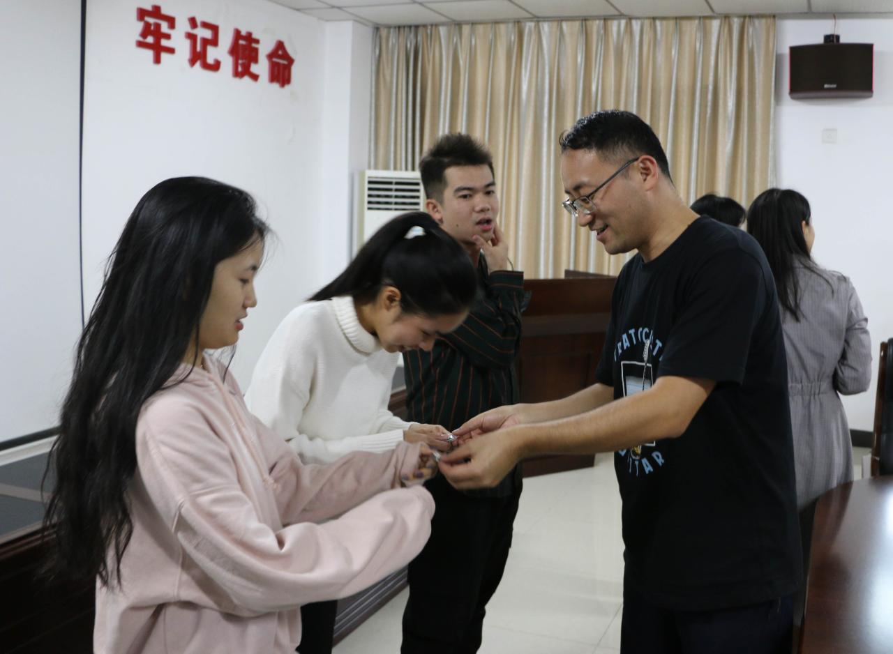 自我介绍结束后,主持人向大家介绍双创营三种徽章的不同含义,并请指导老师为营员颁发徽章。