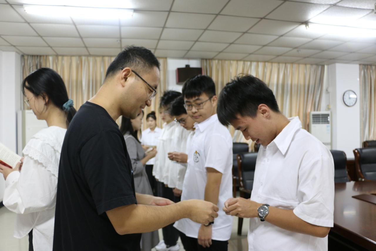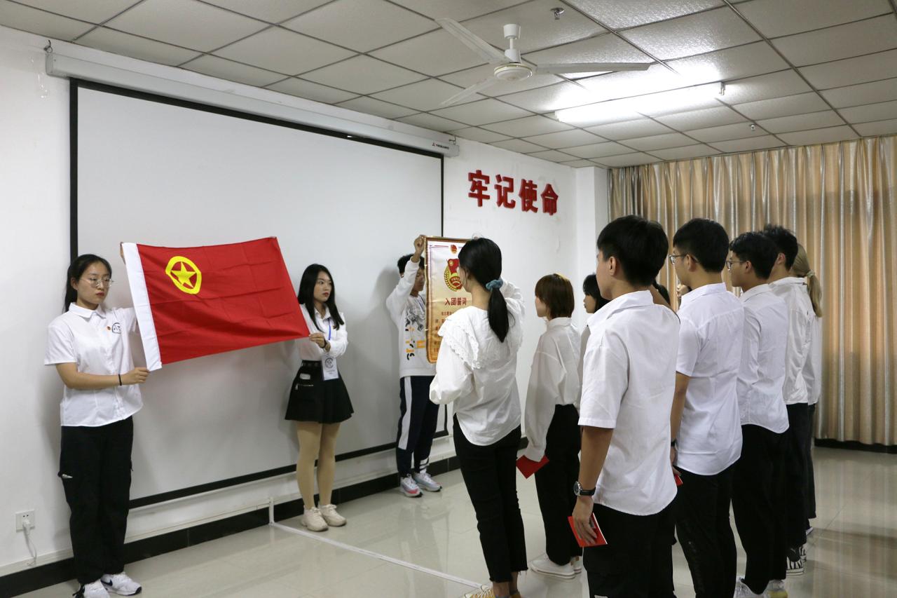 仪式开始,全体人员起立、奏唱国歌。接着,由主持人宣读新团员名单,团委书记公衍峰为新团员颁发团章,辅导员李洁老师为新团员佩戴团徽。