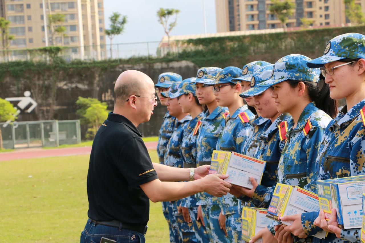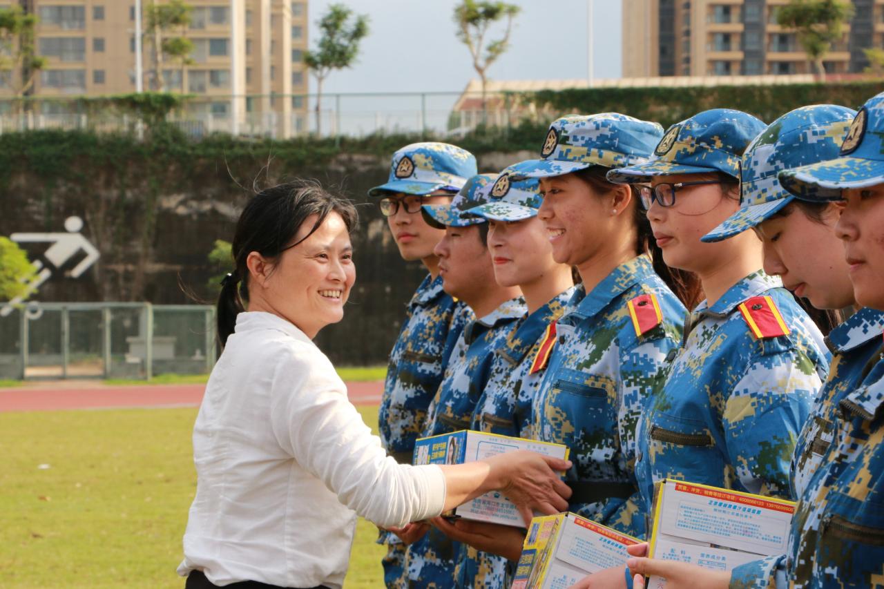 同学们以热烈的掌声以及响亮的口号对老师们的到来表示欢迎。邱书记对同学们在军训中的良好精神风貌表示肯定,强调了军训对于每名员工的重要性。通过军训,同学们不仅可以强健体魄,还能磨炼坚韧的意志。他亲切地嘱咐同学们要注意身体,面对即将进行的缓考同样不能放松。他提出,今年的军训情况特殊,同学们既需要在白天认真参加训练,又需要在晚间抓紧复习考试。对此,邱书记对同学们进行了赞扬和鼓励。随后,老师们亲手将精心准备的慰问品发放给军训学子,同时勉励同学们在接下来的训练中再接再厉。