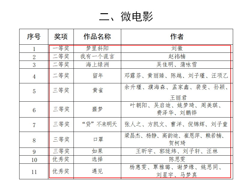 在微电影类作品中,公司戏剧影视专业员工充分发挥专业优势,创作出大批优秀作品,斩获微电影类作品所有奖项。(红框内为公司师生作品及所获奖项)