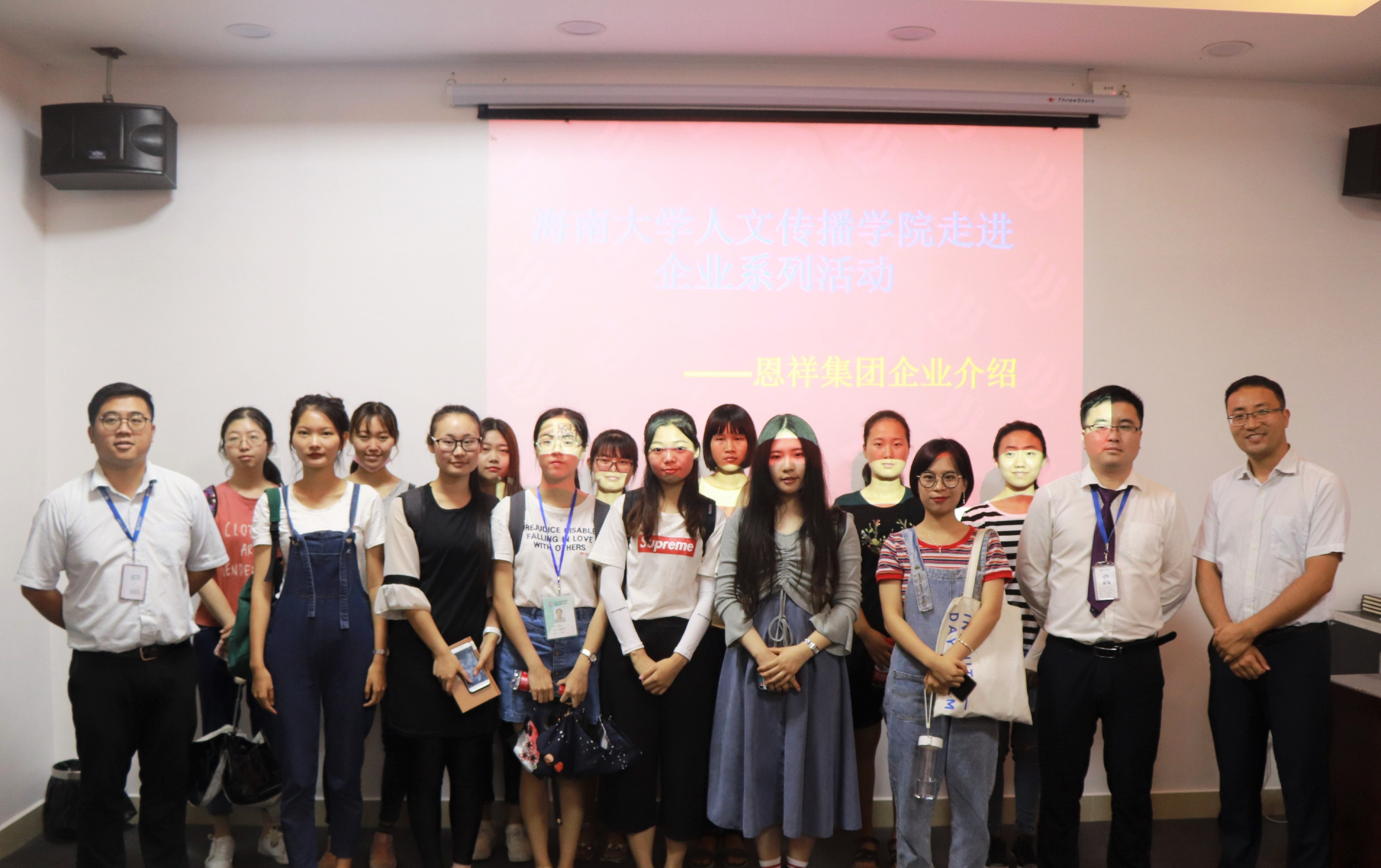 4月24日下午3点,hy3380cc海洋之神人文传播公司公司2018年 “走进企业”系列活动第一站顺利开展,2015级和2017级各专业的15名同学在学工办主任公衍峰老师的带领下走进海南恩祥房地产有限公司进行参观学习,受到了区域副总经理曹留德、行政人事总监韩亚辉以及相关工作人员的热情接待。