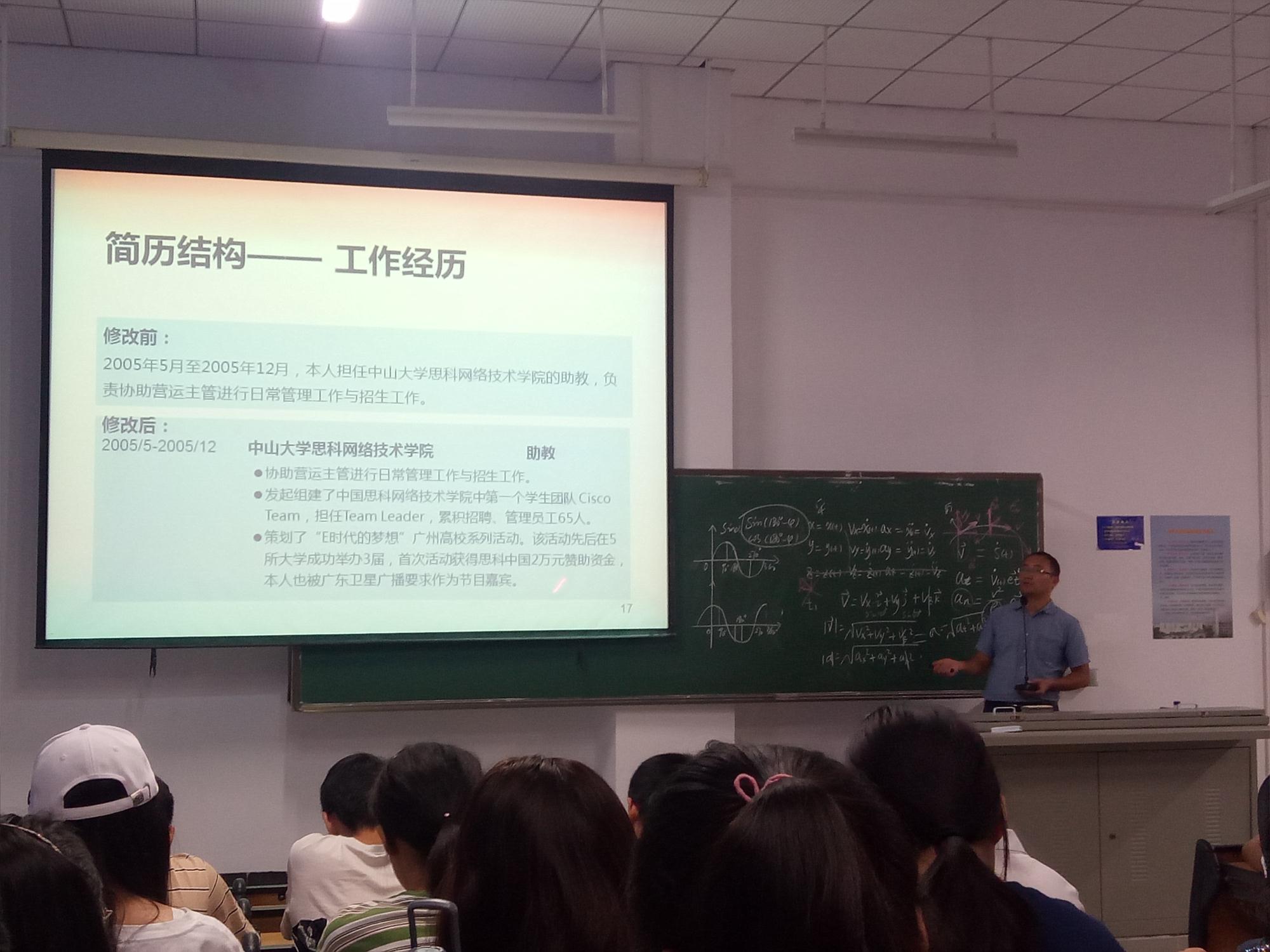 9月29日下午,人文传播公司组织2016级广告学、传播学专业全体员工在5-214参加“如何制作一份吸引人的简历”讲座,这是2018年毕业生就业指导活动月中针对2015、2016级同学开展的第一场职场讲座,学工办公衍峰老师主讲。