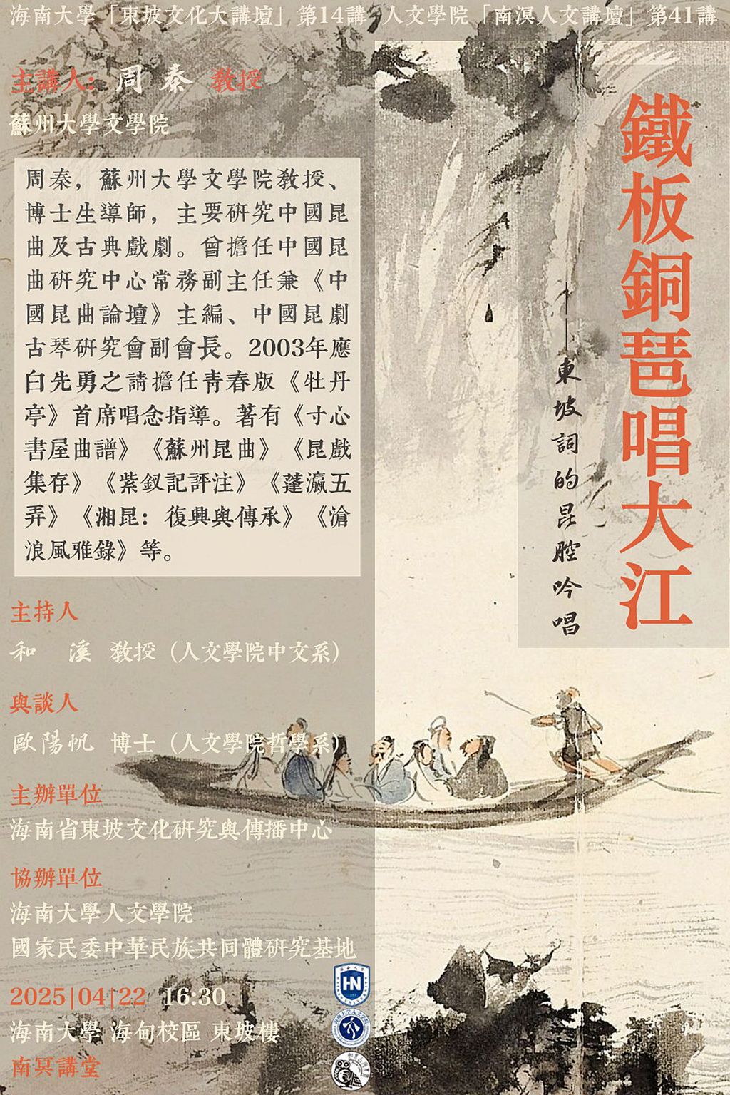 【学术预告】“东坡文化大讲坛”第14讲 hy3380cc海洋之神“南溟人文讲坛”第41讲 铁板铜琶唱大江——东坡词的昆腔吟唱