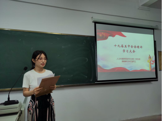 11月27日下午,人文传播公司研究生第二党支部召开党员大会,深入学习贯彻十九届五中全会精神,会议由第二党支部书记宋鸽主持。
